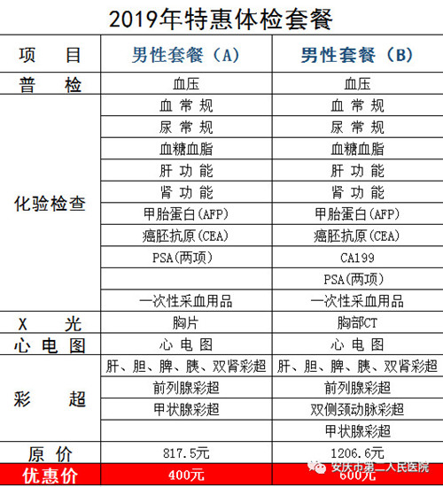 此次体检优惠活动本中心推出4个特惠套餐(男性两个,女性两个),原价1200元的体检套餐现优惠价600元,原价800元的体检套餐现优惠价400元,特别的礼物给特别的您,本中心将热忱为您服务。